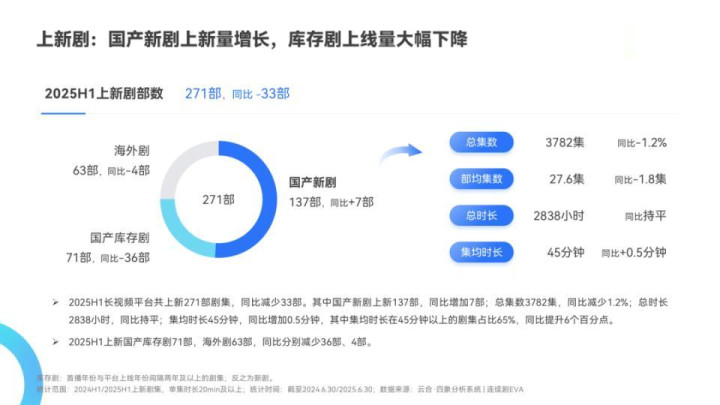 今年上半年,长视频平台共上新271部剧集,其中国产新剧137部,同比增加7部,但库存剧71部,同比减少36部。